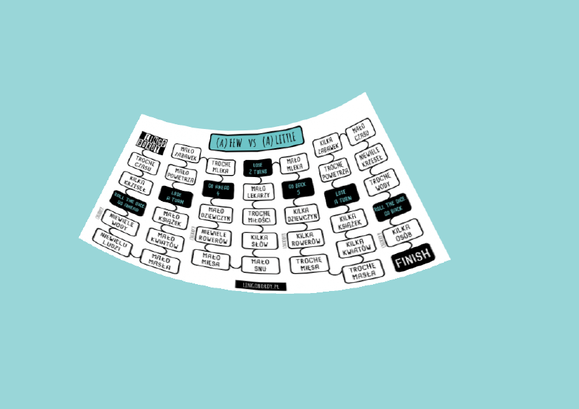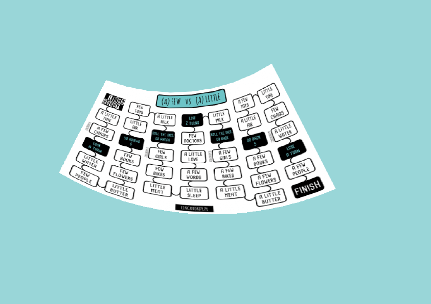 – dwie planszówki – z wyrażeniami a few – few – a little – little połączonymi z odpowiednimi rzeczownikami,